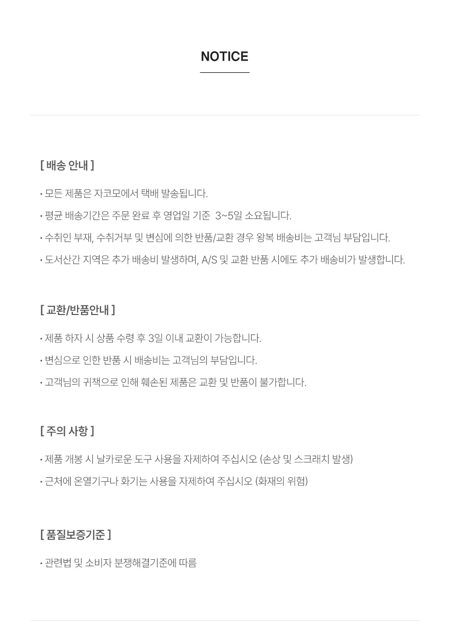 - 가구 특성상 일시적 재고 부족이나 기상이변, 천재지변에 의한 배송지연이 발생할 수 있습니다.