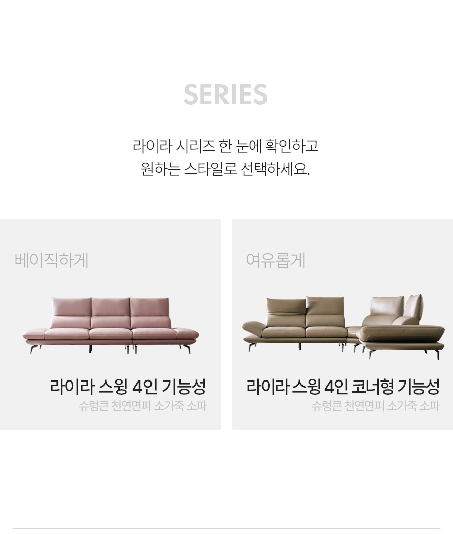 이미지 더보기라이라 스윙 4인 코너형 기능성 슈렁큰 천연면피 소가죽 소파(전측면가죽적용)+쿠션4개