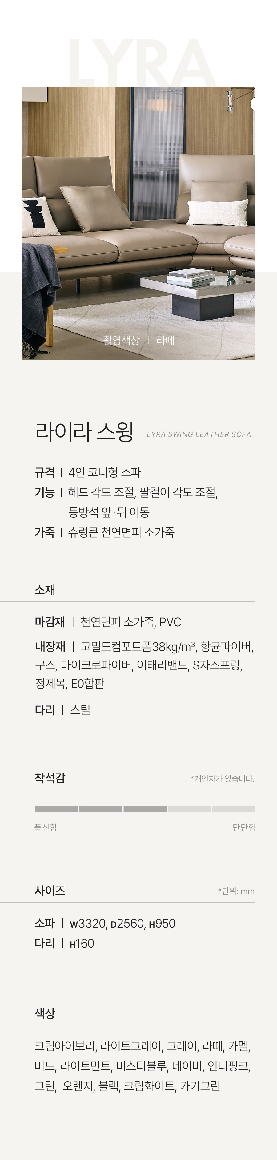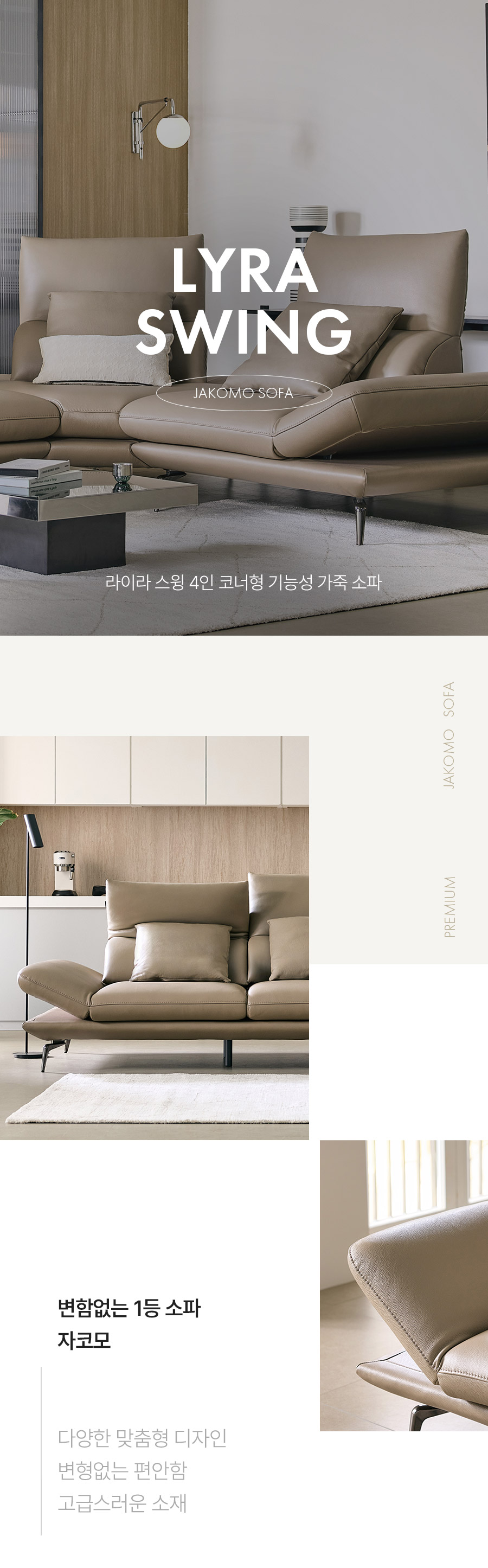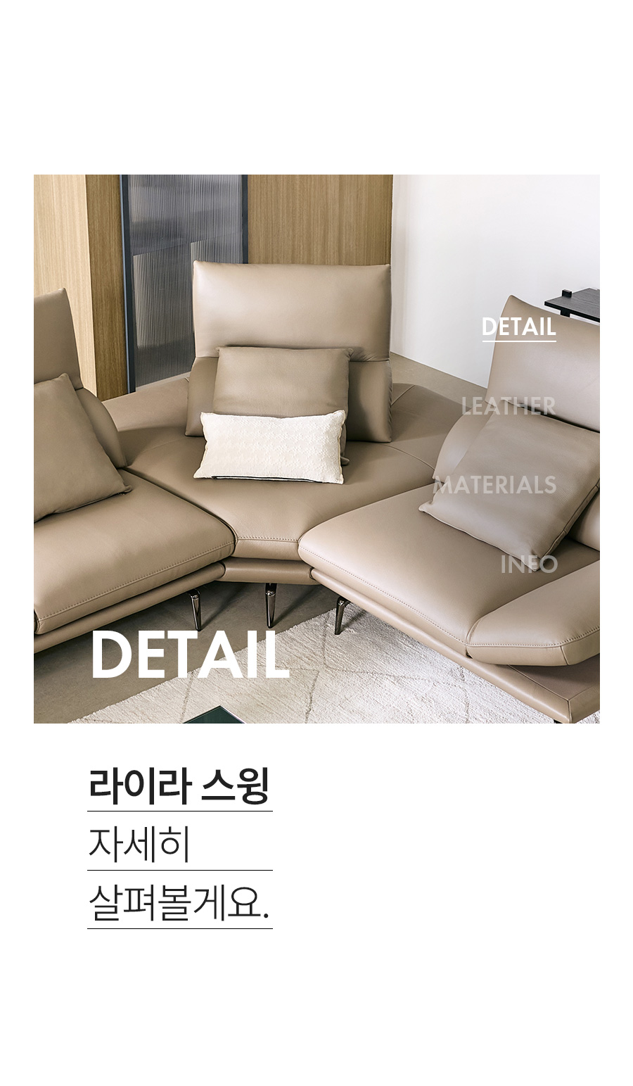 라이라 스윙 4인 코너형 기능성 슈렁큰 천연면피 소가죽 소파(전측면가죽적용)+쿠션4개 7,220,000원 / 배송비 : 무료