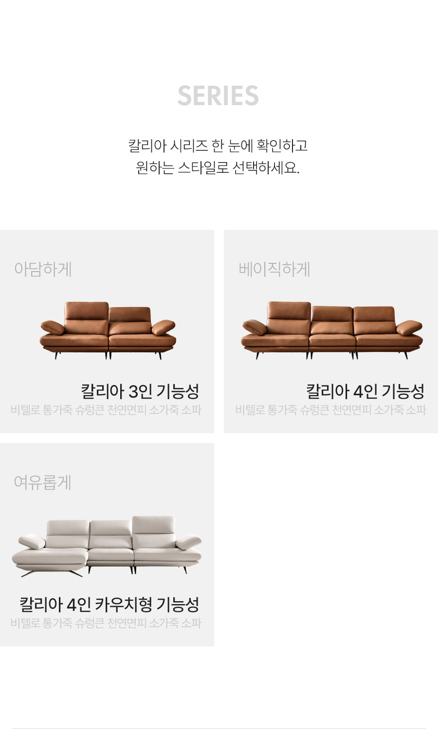 칼리아 4인 카우치형 기능성 비텔로 통가죽 슈렁큰 천연면피 소가죽 소파(전체가죽적용)+쿠션2개 6,970,000원 / 배송비 : 무료