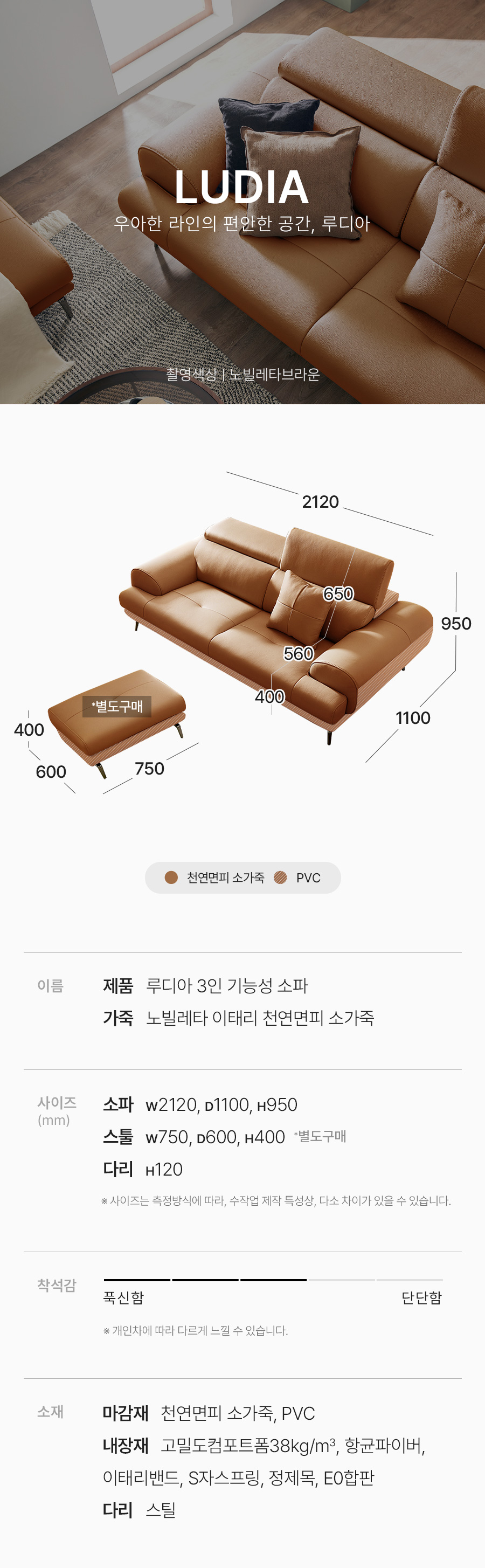 루디아 3인 기능성 노빌레타 이태리 천연면피 소가죽 소파+쿠션1개 2,310,000원 / 배송비 : 무료