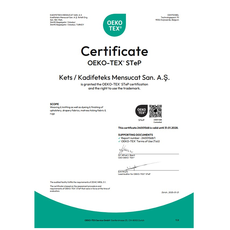 섬유·가죽 생산 과정 전반의 친환경성과 사회적 책임을 평가하는 OEKO-TEX® STeP Level 3 최고 등급 인증 화학물질 관리부터 노동 환경·안전 관리까지 검증된 가능한 생산 방식 적용