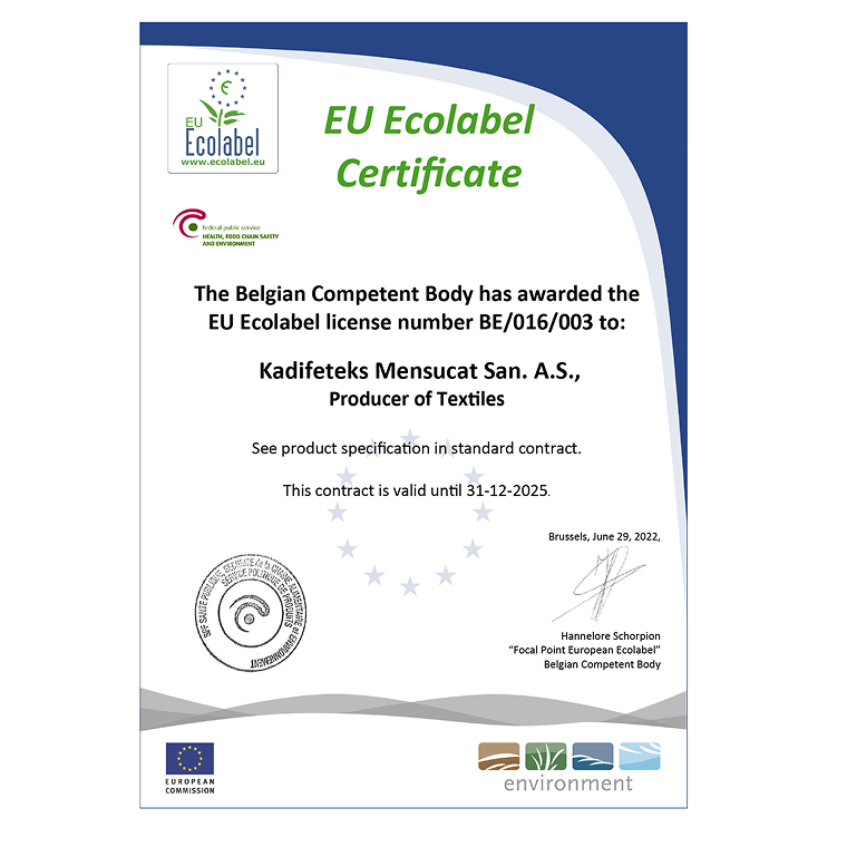 유럽연합이 부여하는 친환경 인증 마크 획득 환경 유해 화학물질을 배제하고 자원·에너지 절감 공정을 거친 유럽이 인정한 친환경 원단
