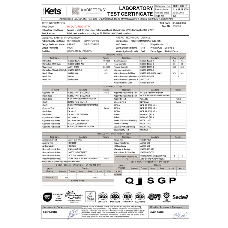 100,000회 이상 마모 테스트 통과, EN1021·BS5852 난연성 국제 규격 충족 FITI 시험에서 황색포도상구균·폐렴균에 대해 99.9% 항균 효과 검증