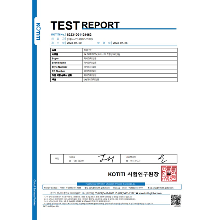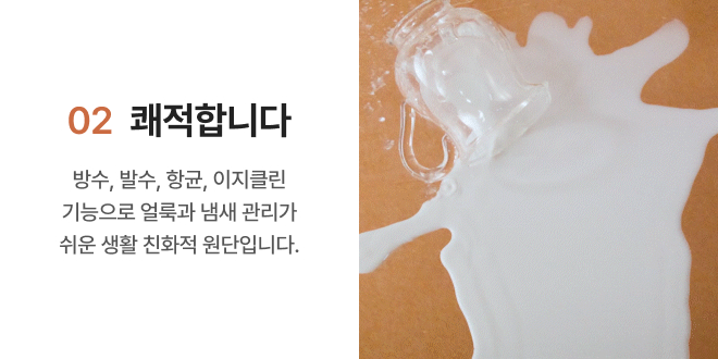 국내 KOTTI 시험연구원 검증으로 유해물질 불검출 확인 생활 발수 기능 시험까지 통과해 커피·주스 등 액체에도 강한 생활 친화적 원단