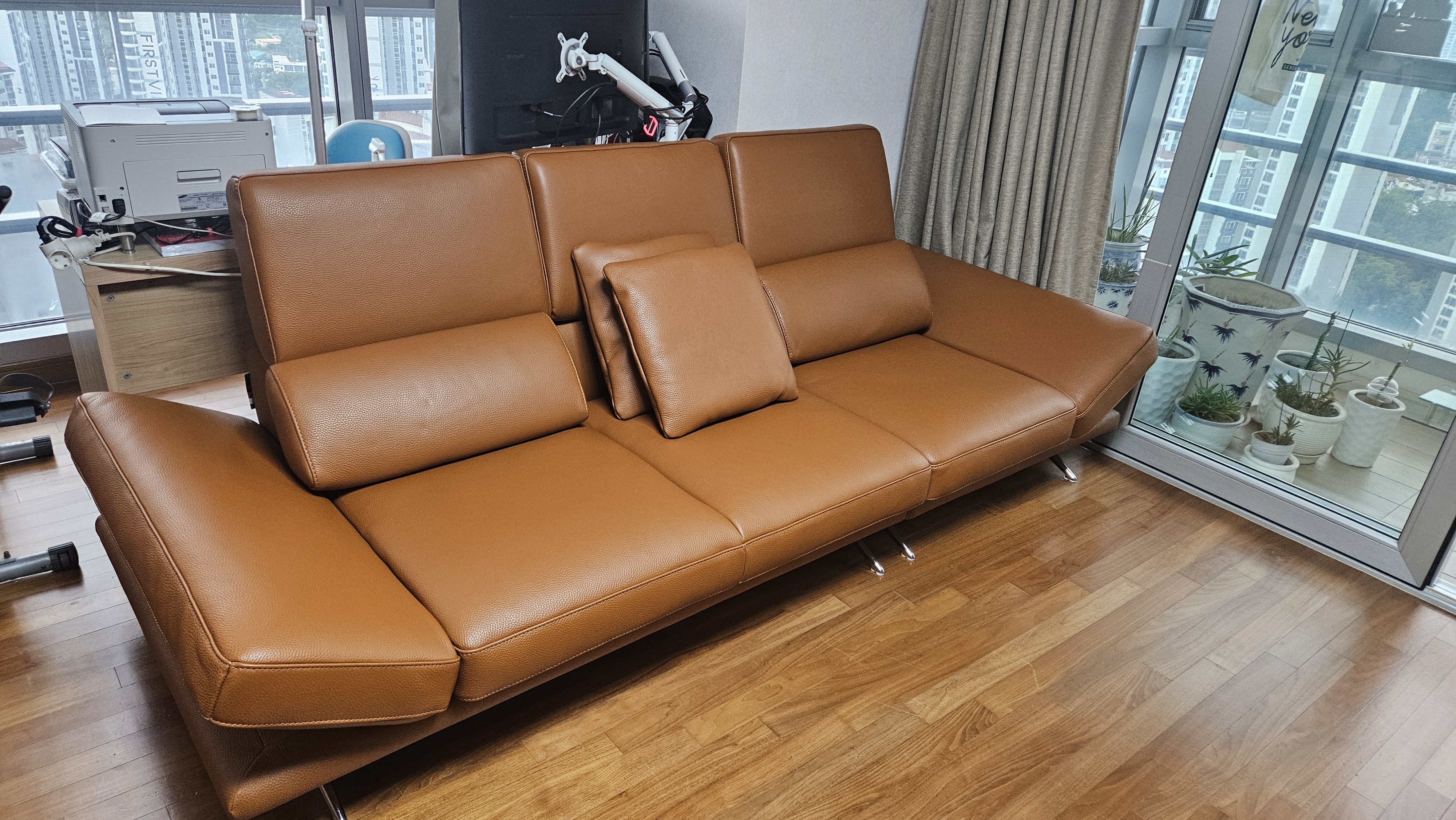 이미지 더보기[소파 탐구 생활 5%] 시그니처 하이 3.5인 기능성 럭스 통가죽 천연면피 소가죽 소파+쿠션4개(허리2개/소2개)