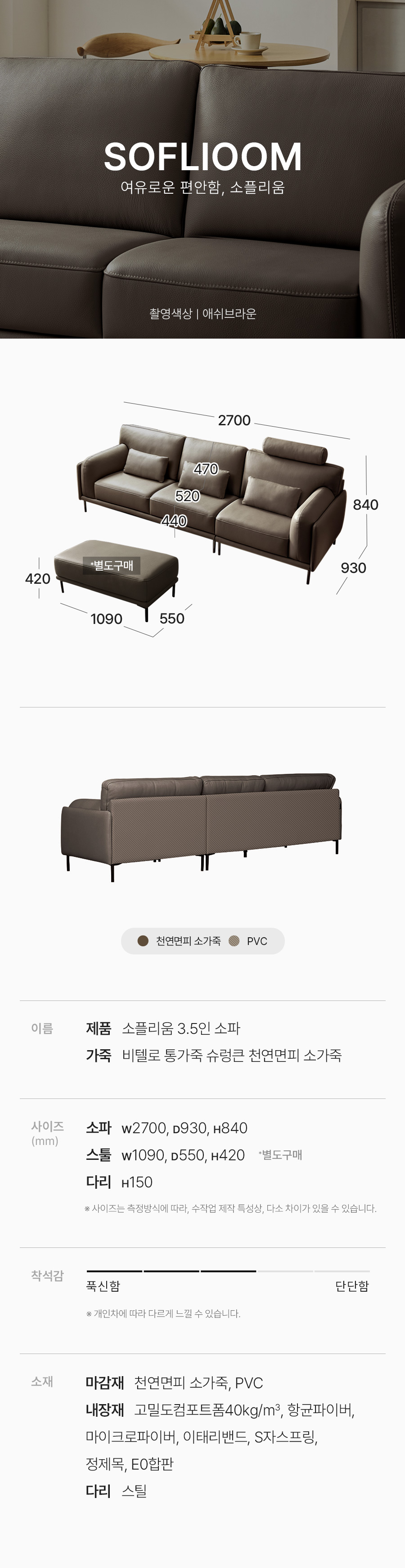소플리움 3.5인 비텔로 통가죽 슈렁큰 천연면피 소가죽 소파(전측면가죽적용)+쿠션3개 5,520,000원 / 배송비 : 무료